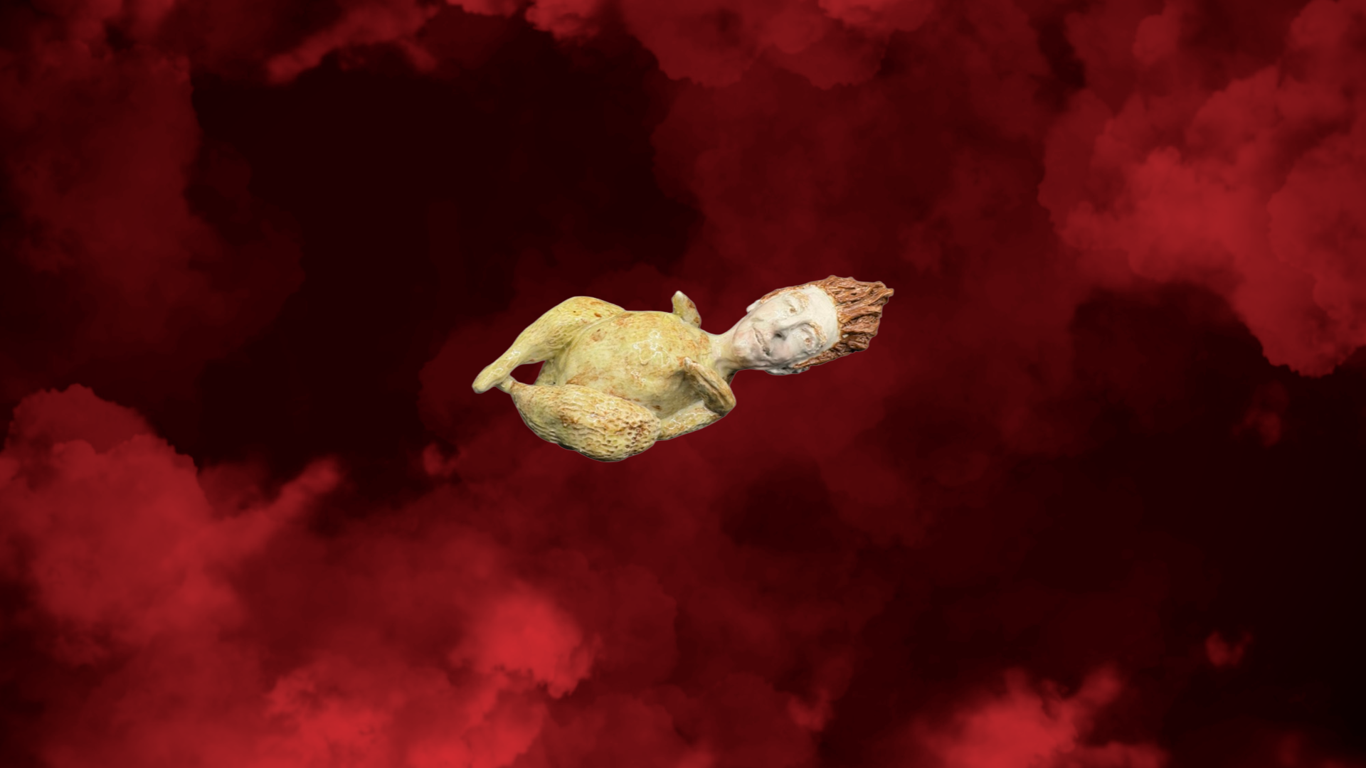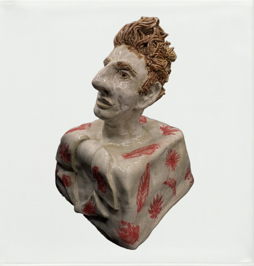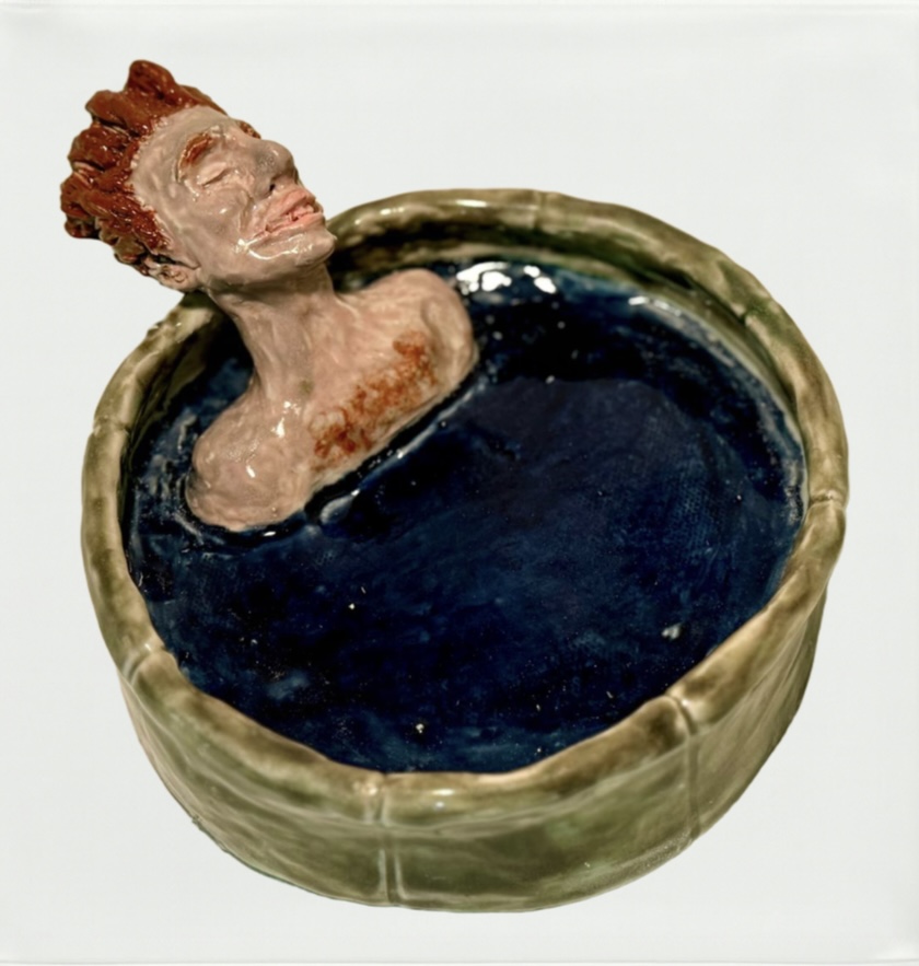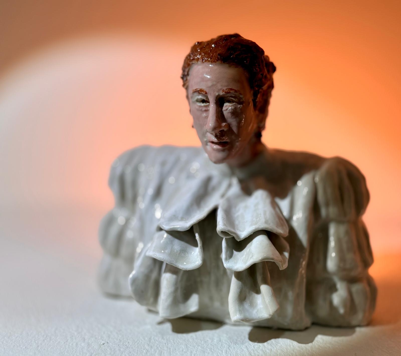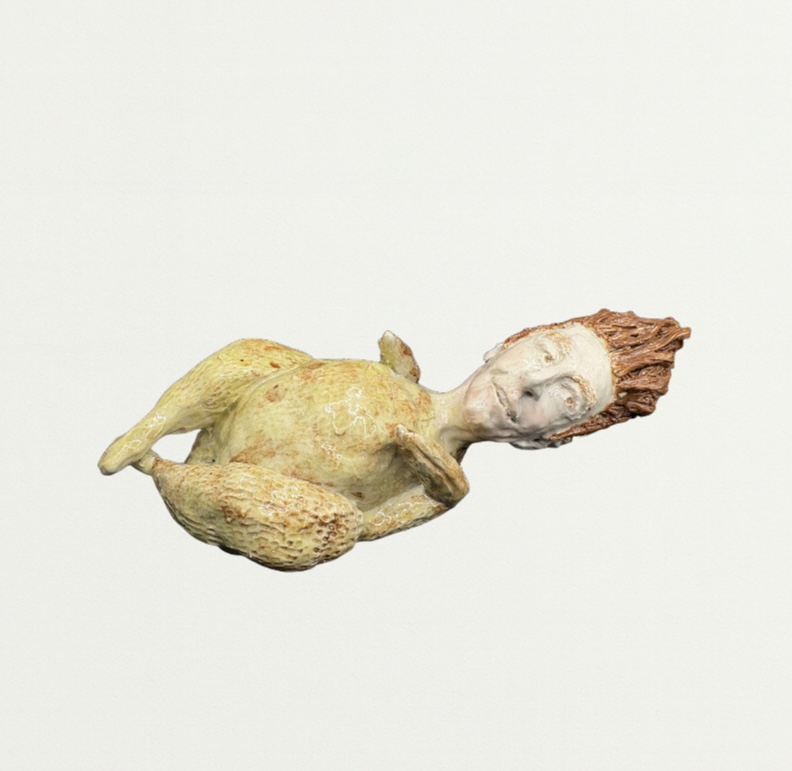 Each piece references a specific episode. “The Hot Tub” captures Kramer after spending the night in freezing water when his heat pump breaks, his body suspended in deep blue glaze, where slapstick shifts into stillness. “The Butter Shave” reimagines Newman’s hallucination of Kramer as a turkey, turning a special-effects joke into a fully embodied sculptural transformation. “The Puffy Shirt” explores the flamboyant costume Jerry unknowingly agrees to wear on television, examining how clothing can overtake identity and turn misunderstanding into spectacle. Finally, the Kramer bust distills the character into expression alone—his posture, hair, and animated features capturing a personality perpetually in motion.