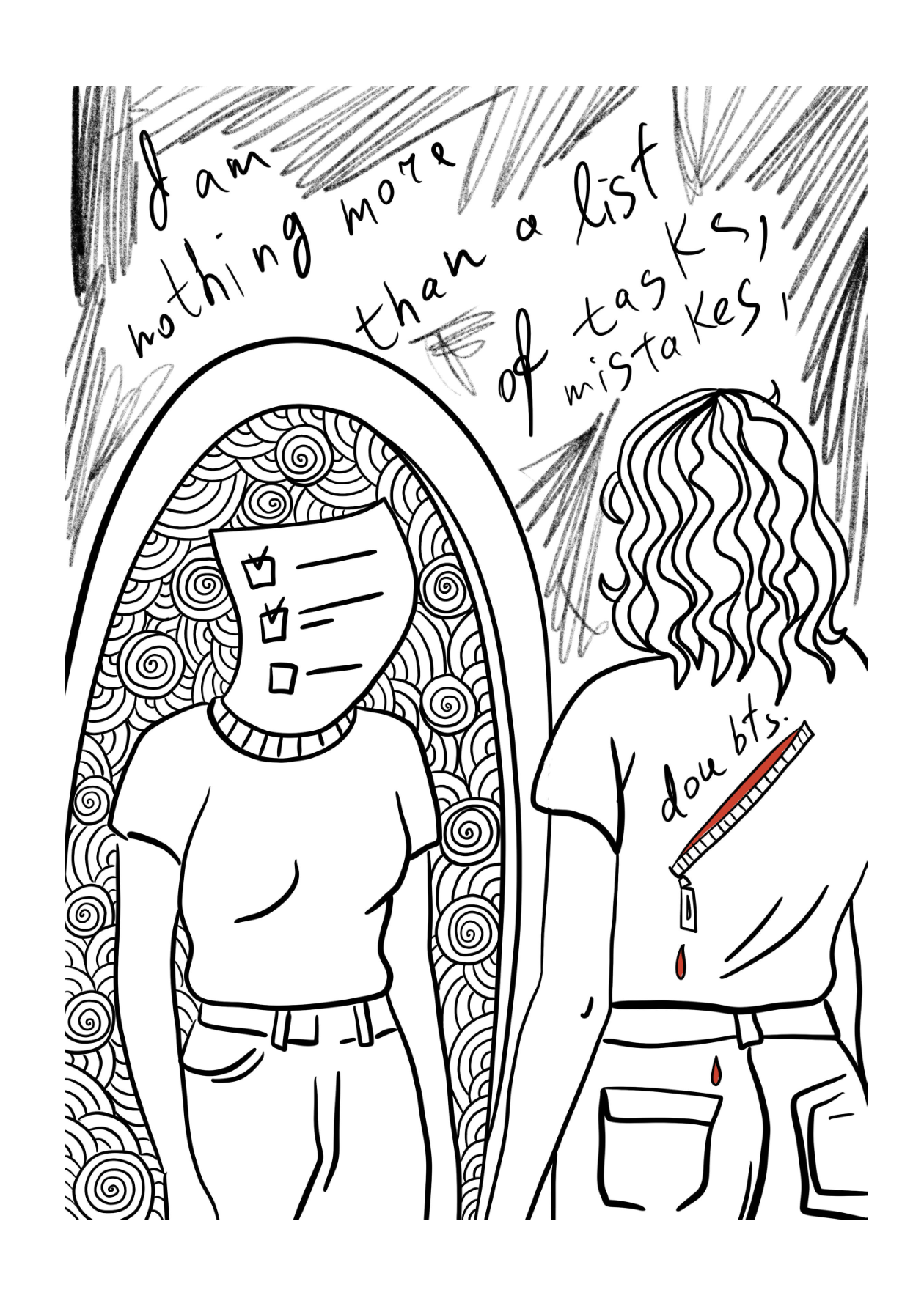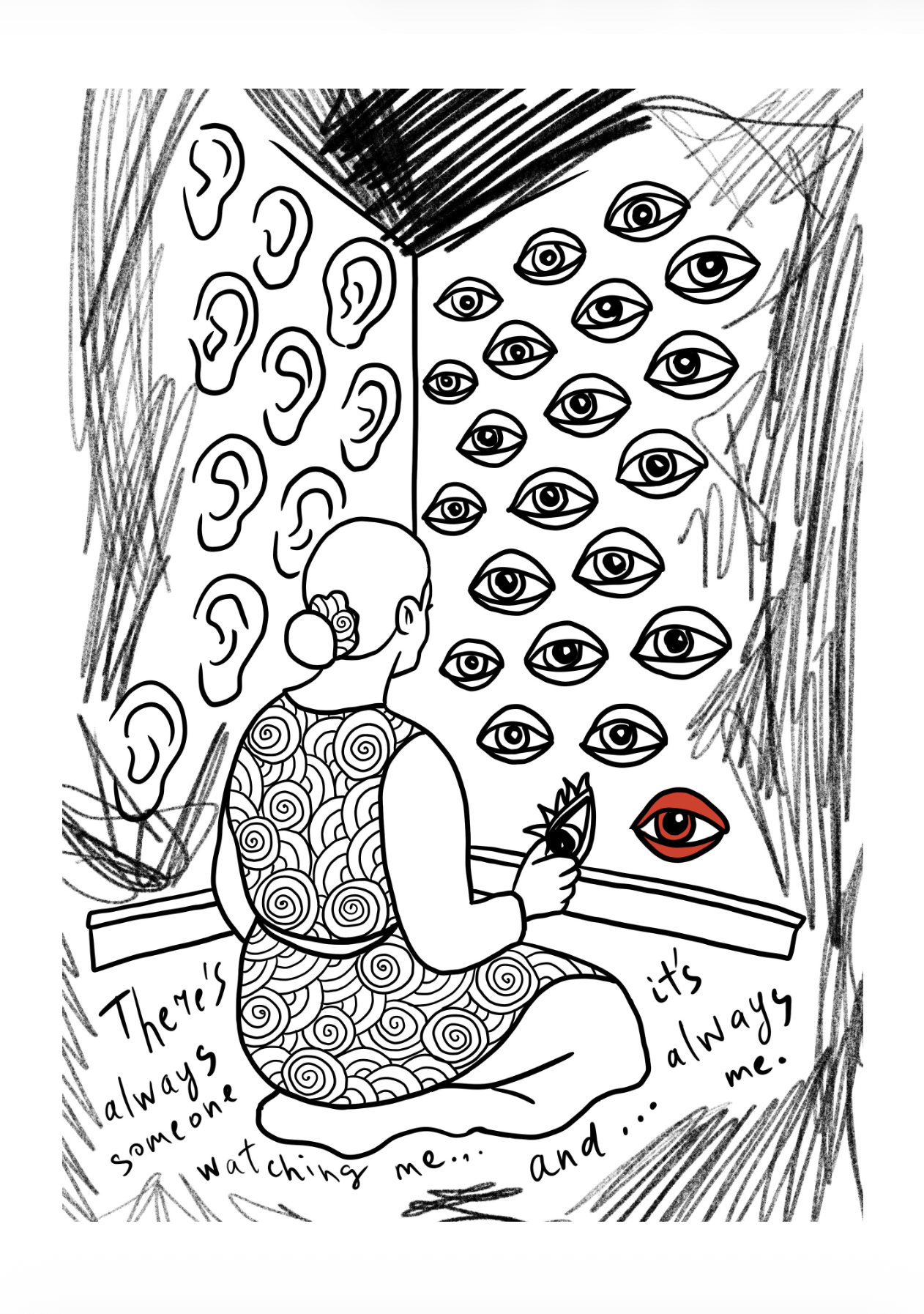 “My Mental Room” is a cartography of obsessive thoughts, anxiety loops, and the fragile architecture of resilience rooted in my personal experience of living with OCD and navigating mental health. Each drawing acts to trap an emotion on paper so that it can neither dissolve nor overwhelm me.